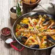 Menumis dasar paella:Panaskan minyak zaitun di wajan besar. Tumis bawang bombay, bawang putih, tomat, dan paprika hingga lembut dan harum. Menambahkan beras:Masukkan beras dan aduk hingga semua butir beras terlapisi